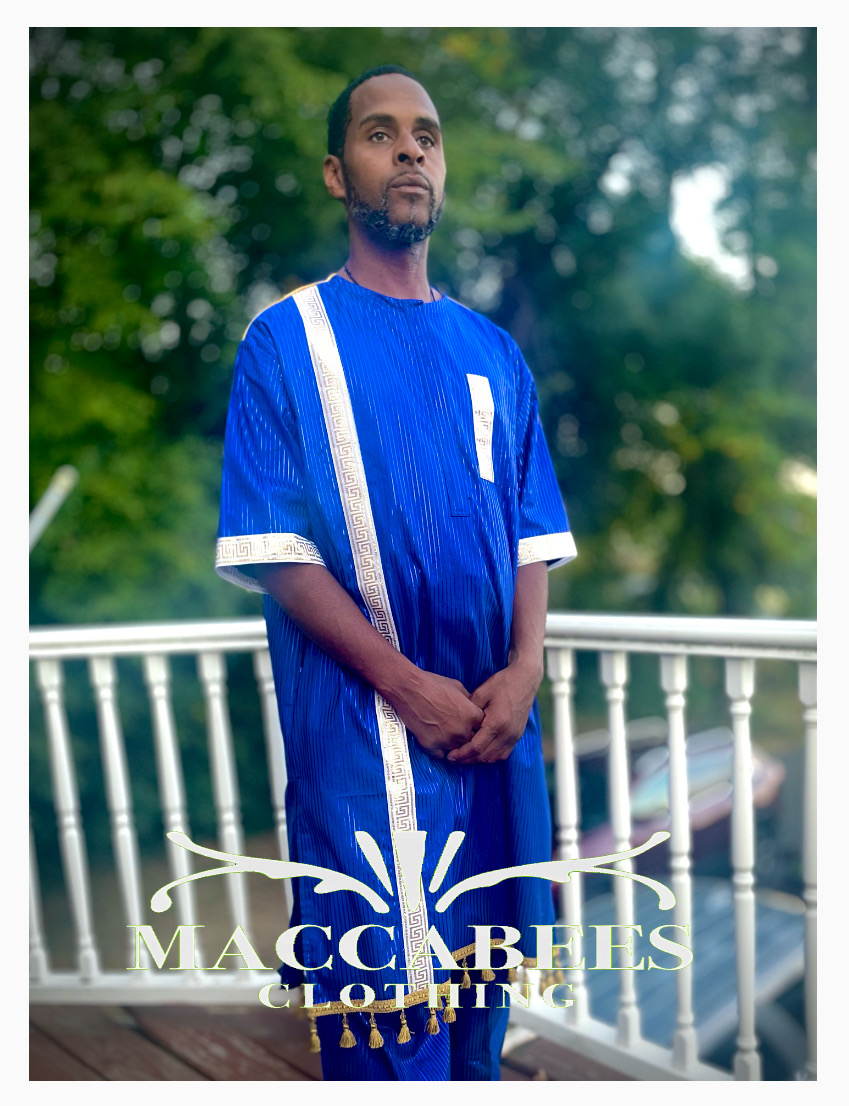 Maccabees one of a kind blue King James collection garments set made with 100% cotton including gold tassels and pants not shown.